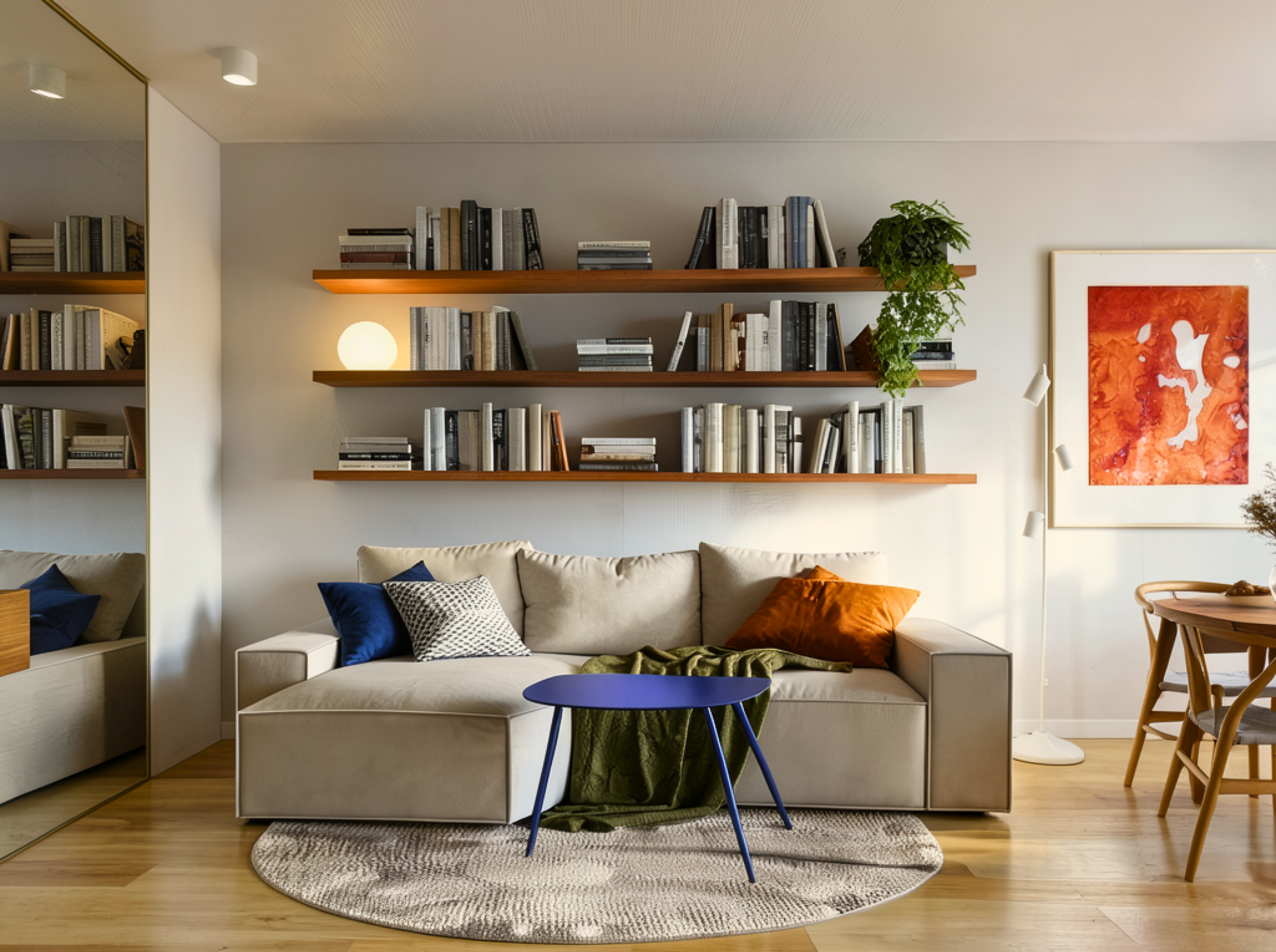 Od początku wiedziałam też, że książki będą ważnym elementem tego wnętrza. Dlatego nad kanapą zaprojektowałam proste drewniane półki, które pełnią rolę domowej biblioteki.