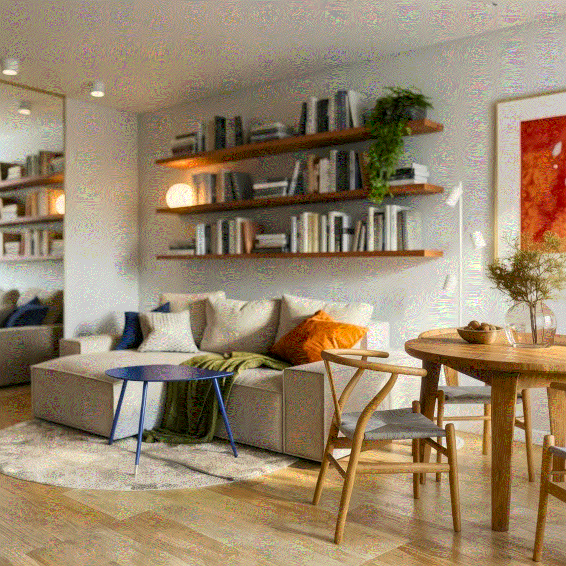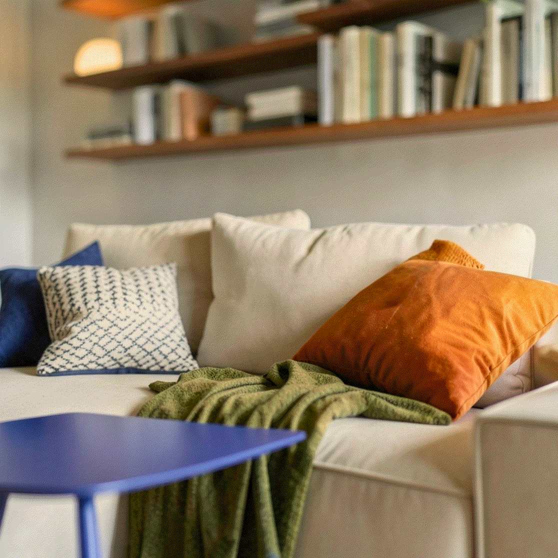 Apricot wprowadza miękkość i ciepło, a kobalt dodaje energii i kontrastu. Kolory pojawiają się w dodatkach, meblach i detalach, dzięki czemu wnętrze jest wyraziste, ale nadal spokojne.