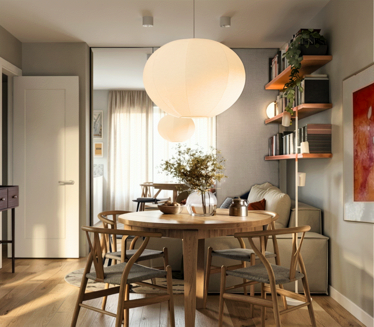 Okrągły, rozkładany stół i lekkie drewniane krzesła nie dominują przestrzeni, ale naturalnie ją dopełniają. Dzięki temu jadalnia pozostaje częścią salonu i codzienne życie może swobodnie toczyć się wokół stołu.
